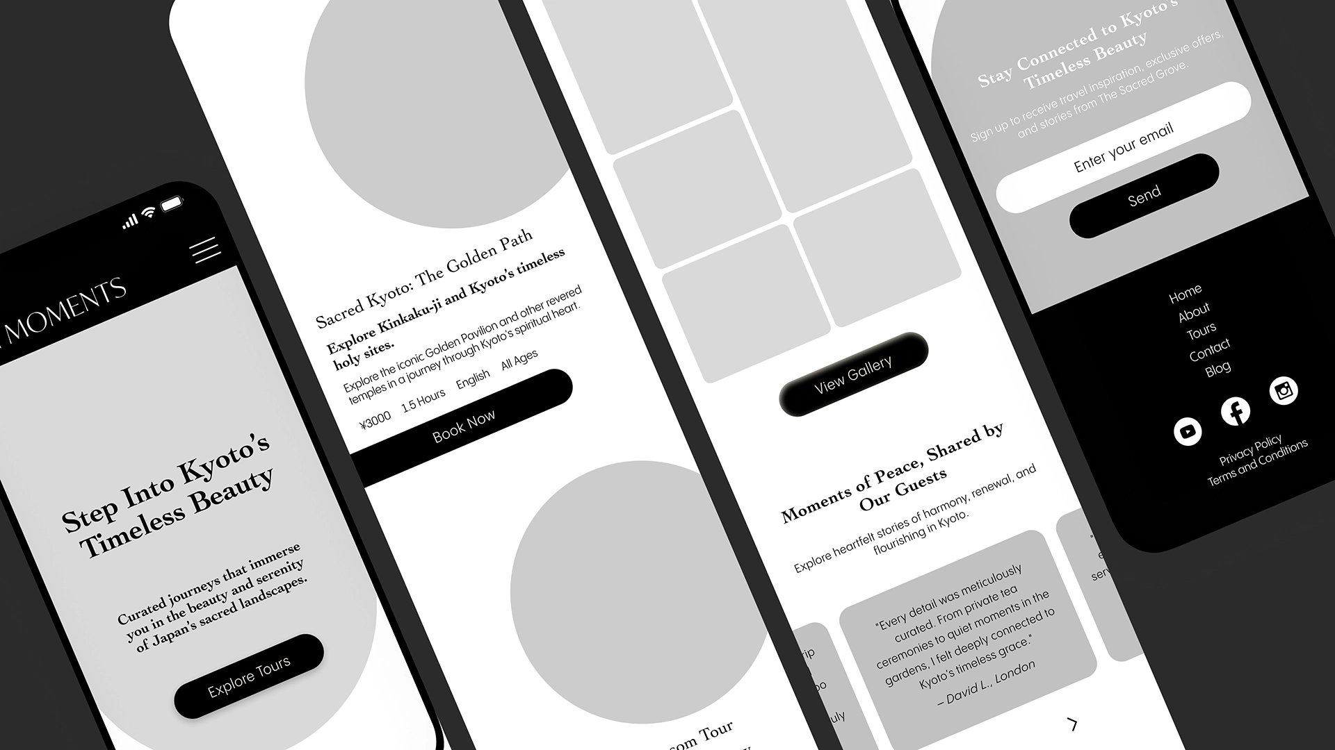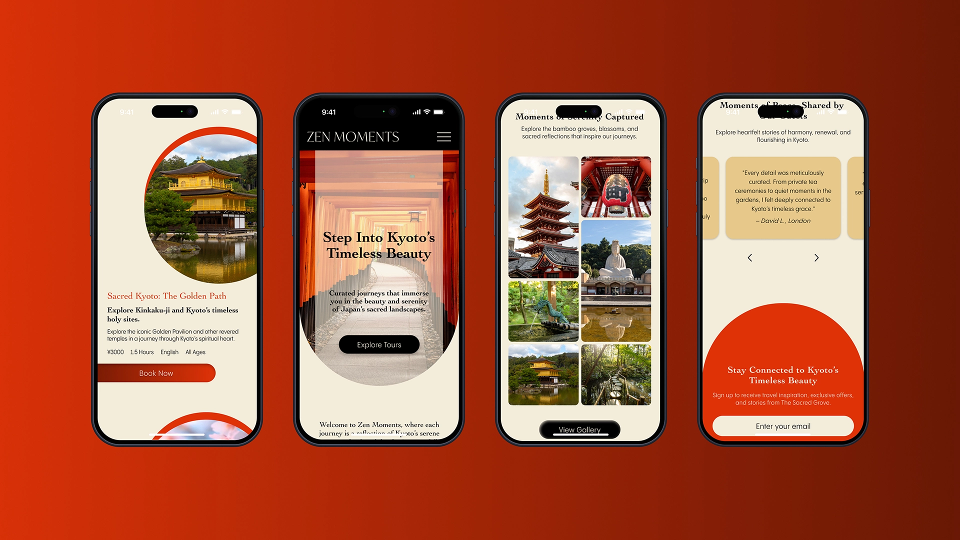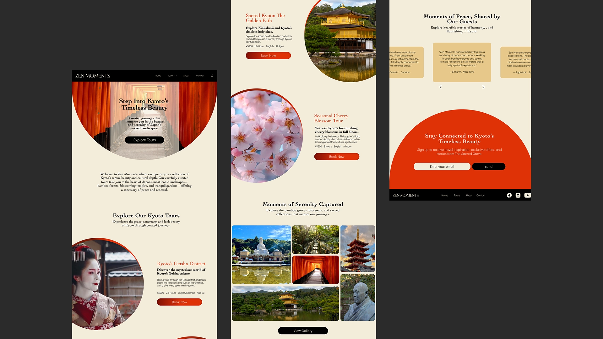 The Zen Moments project is a responsive website design for a luxury travel company offering curated Kyoto tours. Optimized for desktop and mobile, the site emphasizes immersive user experiences and serene aesthetics inspired by Kyoto’s beauty. It showcases my ability to create cohesive, user-centric designs that blend cultural richness with visual elegance and functionality.